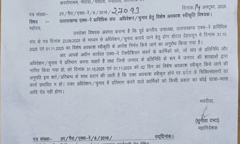 वहीं, संगठन से जुड़े अभय नेगी ने जानकारी दी कि महानिदेशक, चिकित्सा स्वास्थ्य एवं परिवार कल्याण से परामर्श के बाद अब अधिवेशन की तिथि 31 अक्टूबर और 1 नवंबर तय की गई है। इस दौरान संगठन के आगामी कार्यकाल के लिए नए पदाधिकारियों का चुनाव भी संपन्न कराया जाएगा।संगठन के वरिष्ठ सदस्य विनोद पांडे ने कहा कि यह अधिवेशन पूरे प्राविधिक समुदाय के लिए महत्वपूर्ण अवसर है। उन्होंने राज्यभर के एक्स-रे प्राविधिक कर्मचारियों से अपील की कि वे अधिक से अधिक संख्या में अधिवेशन में उपस्थित होकर अपनी भागीदारी और एकजुटता दर्ज करें।अधिवेशन में संगठन के विभिन्न जिला इकाइयों के प्रतिनिधि भी भाग लेंगे, जिसमें संवर्ग से जुड़े मुद्दों जैसे—पदोन्नति, वेतन विसंगति, सेवा शर्तों में सुधार और कार्यस्थल की सुविधाओं पर विस्तार से चर्चा की जाएगी।