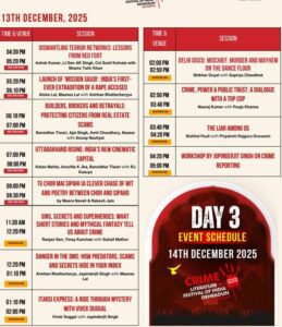 उद्घाटन दिवस में केतन मेहता और आलोक लाल के बीच विशेष चर्चा होगी, जिसमें सत्र ‘मिर्च मसाला से मांझी तक’ में अन्याय पर सिनेमा की दृष्टि पर बातचीत होगी। इसके बाद एक हाई-पावर सत्र ‘द एनफोर्सर – भारत के बैडलैंड्स में एक आईपीएस अधिकारी की अपराध के खिलाफ जंग’ आयोजित होगा, जिसमें प्रशांत कुमार, अनिरुद्ध्य मित्रा और अशोक कुमार भाग लेंगे। दूसरे दिन विभिन्न सत्र आयोजित होंगे, जिनमें क्राइम हेल्पलाइन और सड़क कानून, देसी पल्प साहित्य, महिला और अपराध, चार्ल्स सोभराज फाइल्स पर मधुकर जेंदे और नवनीत सेकेरा द्वारा चर्चा शामिल है। दिनभर के सत्रों में आतंकवाद नेटवर्क तोड़ना (अशोक कुमार, ले. जनरल ऐके सिंह और कर्नल सुनील कोटनाला), मिशन साऊदी लॉन्च (आलोक लाल और मानास लाल), और उत्तराखंड को भारत की उभरती फिल्म नगरी बनाने पर चर्चा (केतन मेहता, अनुरिता के झा, बंसिधर तिवारी) शामिल हैं। दिन का समापन होगा ‘तू चोर, मैं सिपाही’, जो एक चतुर और मजेदार काव्यात्मक मुकाबला होगा।