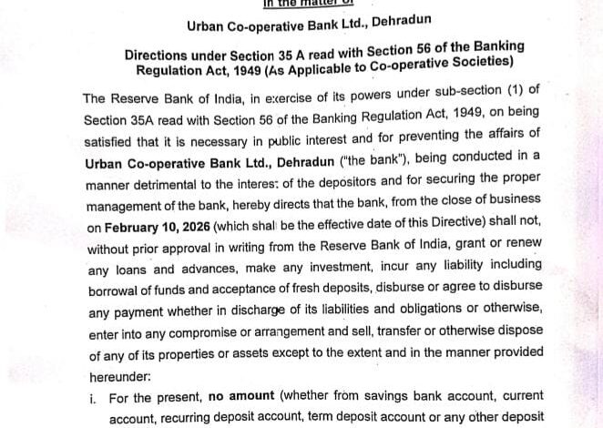 देहरादून। देहरादून का अर्बन कोऑपरेटिव बैंक गहरे वित्तीय संकट में फंस गया है। वर्षों से घाटे में चल रहे बैंक की वास्तविक स्थिति सामने आने के बाद भारतीय रिजर्व बैंक ने बैंक पर छह माह के लिए कड़े प्रतिबंध लगा दिए हैं। इन प्रतिबंधों के तहत खाताधारक फिलहाल अपनी जमा राशि की निकासी नहीं कर पा रहे हैं, जिससे करीब 9 हजार खाताधारकों की चिंता बढ़ गई है।