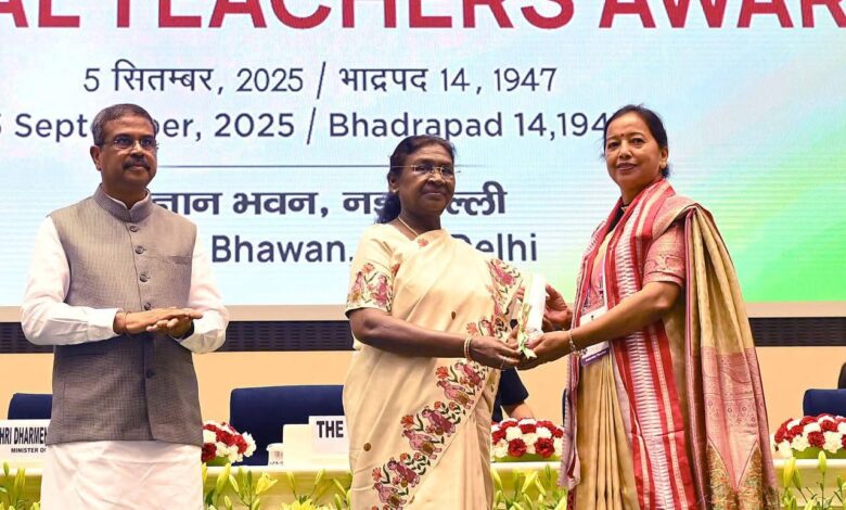 देहरादून। नई दिल्ली स्थित विज्ञान भवन में शुक्रवार को आयोजित राष्ट्रीय शिक्षक पुरस्कार–2025 समारोह में राष्ट्रपति द्रौपदी मुर्मू की उपस्थिति में केन्द्रीय शिक्षा मंत्री धर्मेन्द्र प्रधान ने देशभर के 45 उत्कृष्ट शिक्षकों को सम्मानित किया। इस अवसर पर उत्तराखण्ड के चम्पावत जिले के राजकीय प्राथमिक विद्यालय च्यूरानी की प्रधानाध्यापिका डॉ. मंजू बाला को भी इस प्रतिष्ठित पुरस्कार से अलंकृत किया गया।