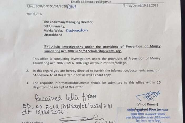 देहरादून। अनुसूचित जाति (SC) और जनजाति (ST) वर्ग के छात्रों की छात्रवृत्ति में हुए कथित बड़े घोटाले की जांच अब निर्णायक मोड़ पर पहुंच चुकी है। प्रवर्तन निदेशालय (ED) ने धनशोधन निवारण अधिनियम (PMLA) के तहत उत्तराखंड के प्रतिष्ठित निजी संस्थान DIT यूनिवर्सिटी के खिलाफ शिकंजा कसना शुरू कर दिया है।ए जेंसी ने विश्वविद्यालय प्रबंधन को नोटिस जारी करते हुए संबंधित वित्तीय लेन-देन, दस्तावेजों और जिम्मेदार व्यक्तियों के बयान तलब किए हैं।
