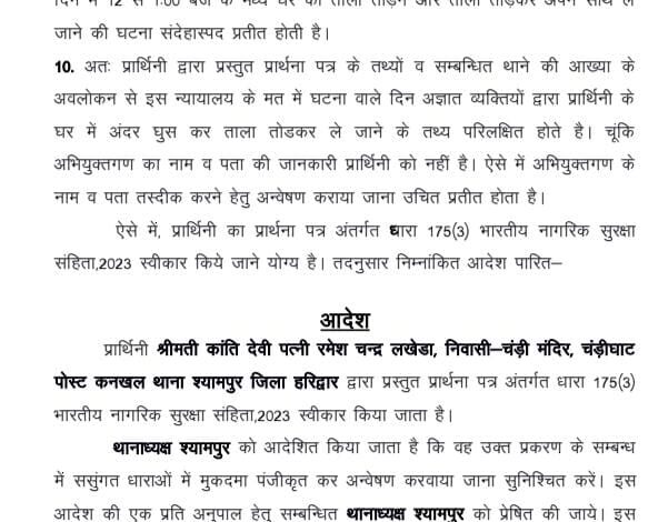 हरिद्वार। श्यामपुर पुलिस की लापरवाही पर न्यायिक मजिस्ट्रेट तृतीय रोहित कुमार पांडेय की अदालत ने सख्ती दिखाते हुए आदेश दिया कि बुज़ुर्ग दंपत्ति के घर ताला तोड़कर घुसपैठ की घटना में श्यामपुर थानेदार को तत्काल FIR दर्ज की जाए और प्रभावी जांच सुनिश्चित हो। अदालत के आदेश के बाद ही 18 सितम्बर 2025 को पुलिस ने FIR दर्ज की।