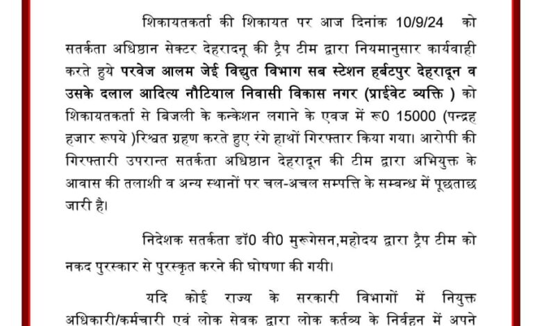 विजिलेंस से मिली जानकारी के मुताबिक विद्युत विभाग के जेई, परवेज आलम एवं उसके सहयोगी (दलाल) आदित्य नौटियाल को रू0 15000 की रिश्वत लेते रंगे हाथो गिरफ्तार किया गया है। शिकायतकर्ता की शिकायत पर आज सतर्कता अधिष्ठान सेक्टर देहरादून की ट्रैप टीम द्वारा नियमानुसार कार्यवाही करते हुये परवेज आलम जेई विद्युत विभाग सब स्टेशन हर्बटपुर देहरादून व उसके दलाल आदित्य नौटियाल निवासी विकास नगर (प्राईवेट व्यक्ति ) को शिकायतकर्ता से बिजली के कन्केशन लगाने के एवज में रू0 15000 (पन्द्रह हजार रूपये )रिश्वत ग्रहण करते हुए रंगे हाथों गिरफ्तार किया गया। आरोपी की गिरफ्तारी उपरान्त सतर्कता अधिष्ठान देहरादून की टीम द्वारा अभियुक्त के आवास की तलाशी व अन्य स्थानों पर चल-अचल सम्पत्ति के सम्बन्ध में पूछताछ जारी है।