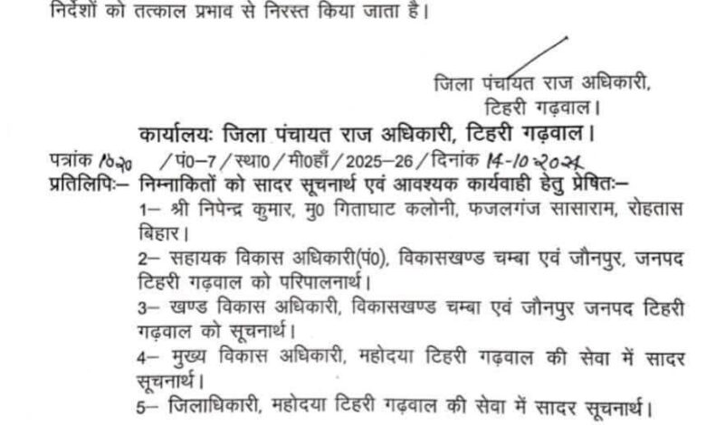 देहरादून। मुख्यमंत्री पुष्कर सिंह धामी ने मकानों पर नंबर प्लेट लगाने के संबंध में जिला पंचायतराज अधिकारी, टिहरी गढ़वाल एवं उत्तरकाशी द्वारा जारी आदेशों को तत्काल प्रभाव से रद्द करने के साथ ही मामले की पूरी जांच कराने और दोषियों के खिलाफ आवश्यक कार्रवाई सुनिश्चित करने के निर्देश दिए हैं।