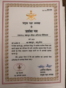 देहरादून। देश की सुरक्षा में महत्वपूर्ण योगदान देने वाले उत्तराखंड के लाल स्क्वाड्रन लीडर अभिनव नौटियाल को ‘ऑपरेशन सिंदूर’ में सराहनीय भूमिका निभाने पर चीफ ऑफ डिफेंस स्टाफ (सीडीएस) द्वारा प्रशंसा पत्र प्रदान किया गया है। इस सम्मान की घोषणा 15 अगस्त 2025 को नई दिल्ली में हुई थी, जो आज स्क्वाड्रन लीडर अभिनव को मिल गया है।